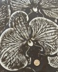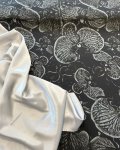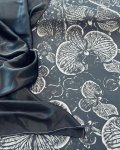 100% Cotton, 60" Wide, Made in Italy. This is Ghost Orchid, a cotton shirting with large scale monochrome orchids on a dark background.