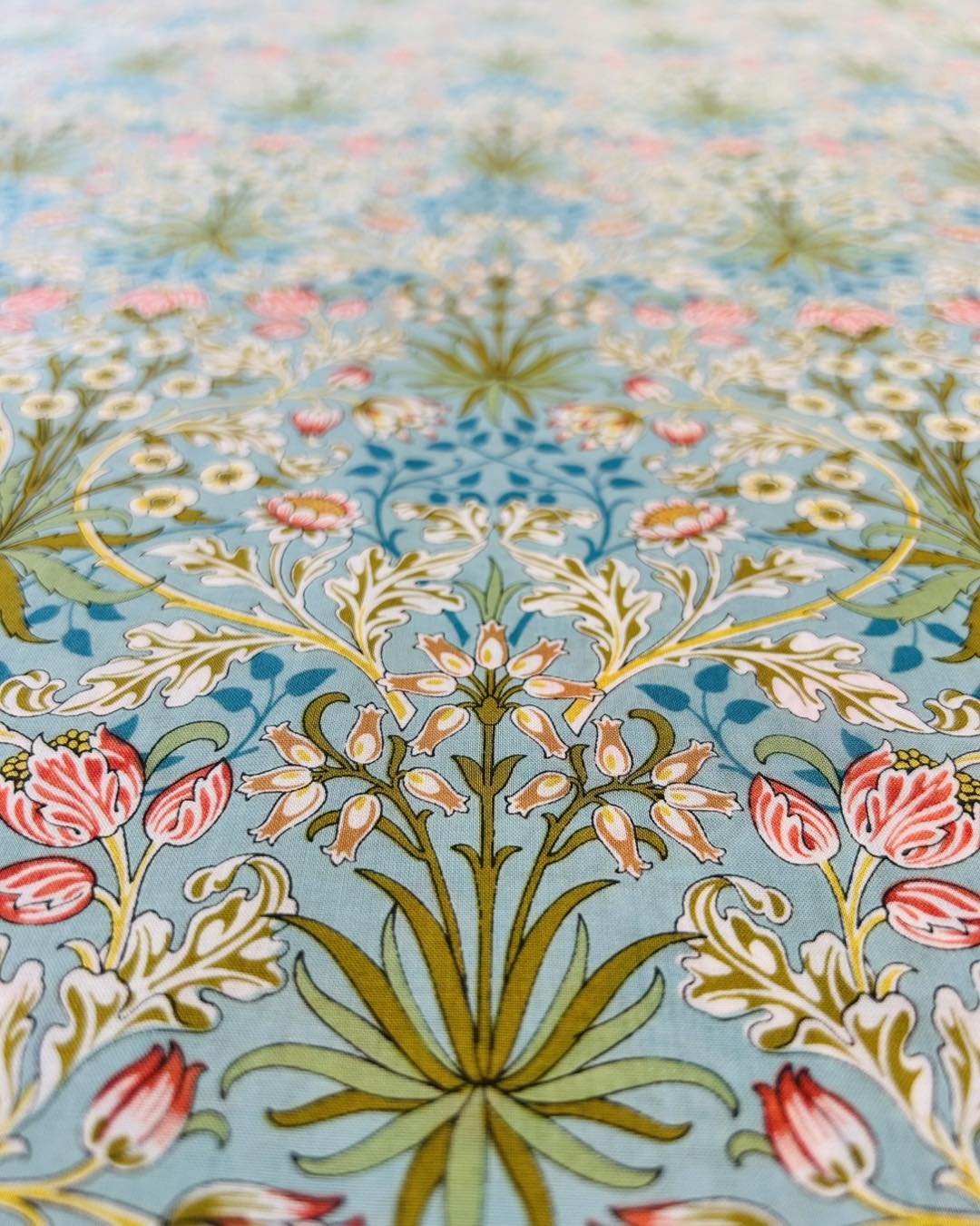 100% cotton, 54" wide, made in Korea for Free Spirit. This is Hyacinth in color Mineral. Classic Art Nouveau style print by William Morris on cotton lawn.