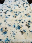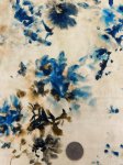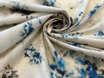 100% Cotton, 56" Wide, Made in Italy. This is Petal Impression, a cotton lawn print with a vaguely floral design in vibrant blue and brown on a cream background.