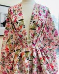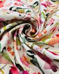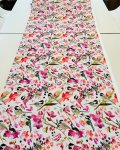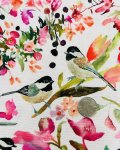 100% Cotton, 43" Wide, Made in Korea. This is Chickadee, a lightweight canvas from Windham with red and purple-pink florals and chickadees on an off-white background.
