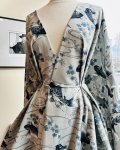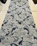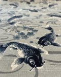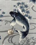 100% cotton, 44" wide, made in Japan. This is Blue Koi Dobby, beautiful ornamental fish print in Indigo color on a medium weight textural cotton. Background is a pale grey with blue cherry blossoms.