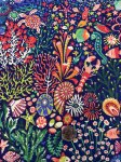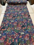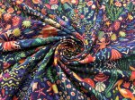 95% Cotton | 5% Spandex, 54" Wide. This is Atlantis in Blue, a cotton jersey knit with an undersea theme on a dark blue background.