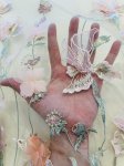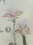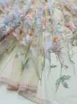 This is Fairy Forage, dimensional, embroidered tulle in gentle tones of peach and sage green. The tulle is 54" wide.