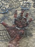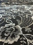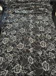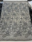 Night Court Embroidered and Sequined Lace. The Lace is black and the embroidery is gunmetal silver grey with clear sequins glittering like stars in the night time sky. Shown here over black silk twill and also directly on the table.
