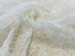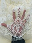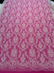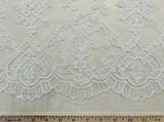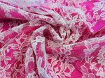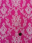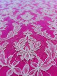 Reimbroidered chantilly lace in white, 65" wide. This is Victoria Chantilly lace, a designer dead stock lace shown over shocking pink so that you can see the lace motif design. Swipe right to see it over our cutting table too