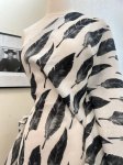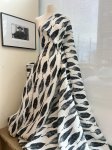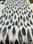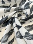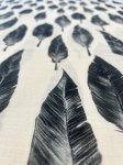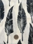 100% linen, 54" wide. This is Fine Feathers Printed Linen, black feathers all aligned neatly on a white background