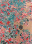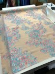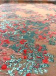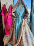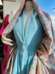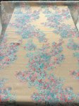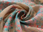 55" wide, made in France, this is Magical Hydrangea silk blend, metallic, jacquard, matelasse. 19% silk, 19% rayon, 49% polyester, 5% nylon, 8% metallic. Shown paired with aqua 4 ply silk crepe