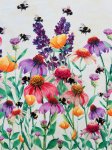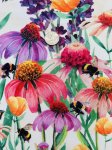 100% Cotton, 44" Wide. This is Buzzing Around, a Hoffman Spectrum border print featuring big, juicy, pink and purple echinacea, poppies, aster and lavender being pollinated by furry, friendly, bumble bees