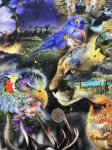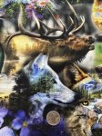 100% Cotton, 44" Wide. This is Wild & Woven, a print from Hoffman featuring highly detailed overlapping animals with nature shots and scenery overlaid on top.