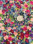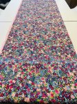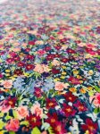 100% rayon, 44" wide, made in Jaoan for moda. This is Garden Glitter in Dark, small scale painterly floral on a navy-blue background.