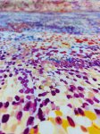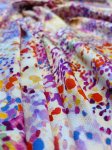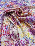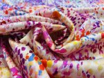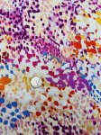 Silk/Lycra, 54" Wide. This is Poppy District, a 2-way stretch hammered silk with a bunch of bright dots in lots of colors as the print.