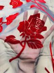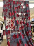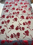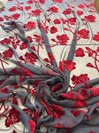 18% silk, 82% rayon. 54" Wide. This is extraordinarily rich and beautiful Dark Rose Cut Silk Velvet. Here we have a truly exquisite piece of silk rayon blend burnout velvet. A deep, rich red stenciled rose floats on a a dark ash grey background.
