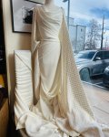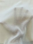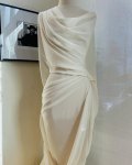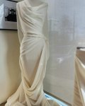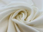 100% wool, 60" wide. This is Cloud Dancer Winter White Wool Challis, light weight, slightly sheer and super soft in the hand. Shown paired with a Gucci tweed in cream